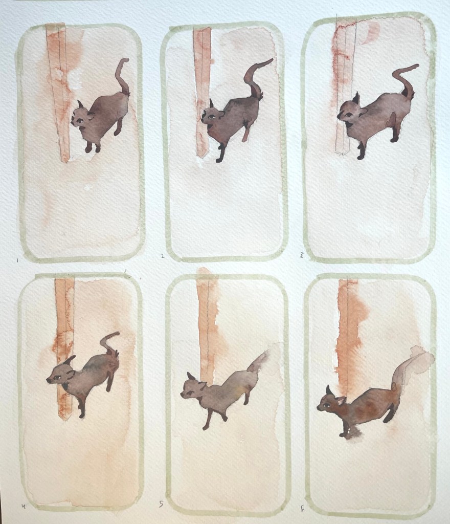 I used a single large piece of cheap watercolor paper, and traced around my phone case to create the boundaries of each frame. That way the sizing would be relatively consistent, and I could take photos of each frame and compile them digitally. All six frames were painted side by side without a light table. Mass and perspective of the table leg shifted quite a bit, but miss Chai Chai moves pretty solidly throughout. I paid special attention to shape of her haunches and the hump of her back as she stretches.