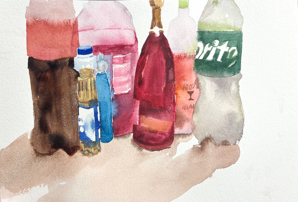 Lastly, we have the remains of one of our many gatherings. We loved to host, and this was the disaster aftermath of Rhiannyn’s birthday party. There was so much liquid housed in plastic and glass, butted up against and overlapping each other. It was a technical challenge and an appreciation for the radioactive colors of the leftover beverages. I had to make sure to leave plenty of white space for the air behind the bottles to show through. I also had to be intentional with my wet-on-dry and wet-on-wet usage.
