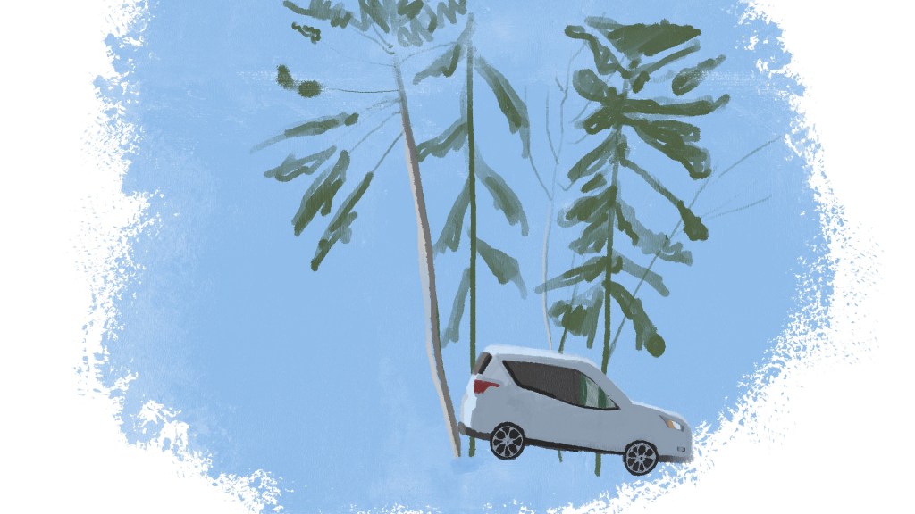 I especially appreciate the delicate marks of the leaf-bare tree branches and piney conifers. I also appreciate the compositional choice to place the vertical blinds askew and at the edge of the frame. It caps off the piece where there would otherwise be white walls creating an endless feeling to the composition.